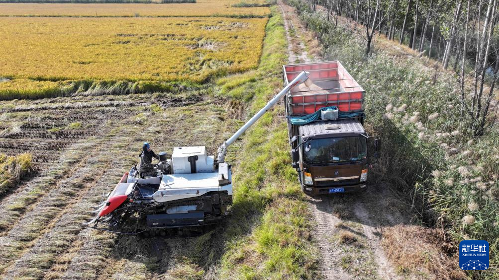 10月11日,在天津市宁河区东赵庄村,农民驾驶收割机将收获的水稻转运至运输车(无人机照片)。