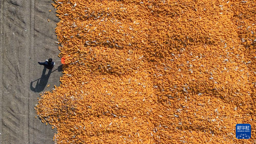 10月11日,在天津市宁河区东赵庄村,农民晾晒刚收获的玉米(无人机照片)。