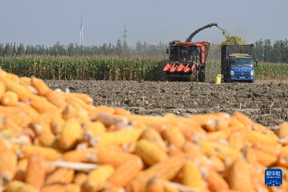10月11日,在天津市宁河区东赵庄村,农民驾驶大型机械收割玉米。