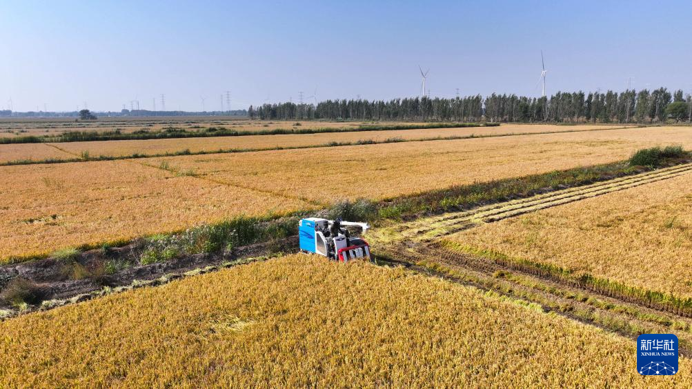 10月11日,在天津市宁河区东赵庄村,农民驾驶收割机收割水稻(无人机照片)。