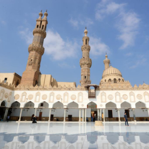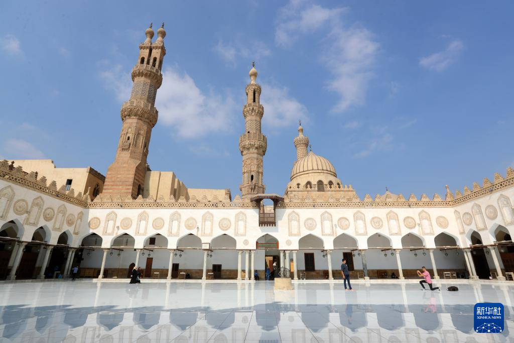 10月10日,游客在埃及开罗老城的爱资哈尔清真寺内拍照。