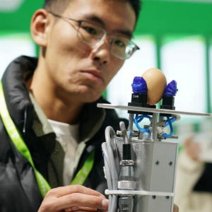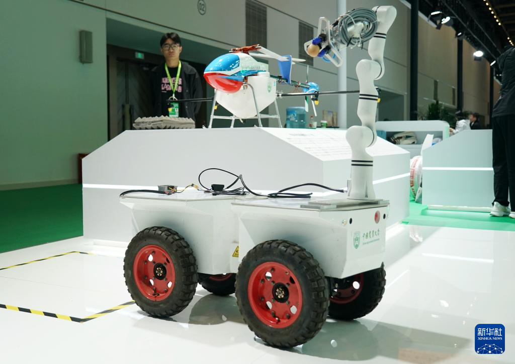 这是10月11日在世界农业科技博览会拍摄的一款四驱铰接式采摘机器人。