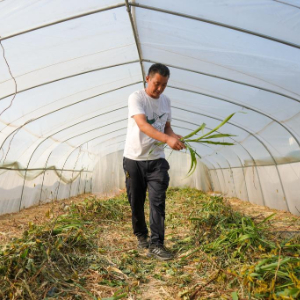 10月11日,院峪村党支部书记王增喜在检查蚂蚱生长情况。