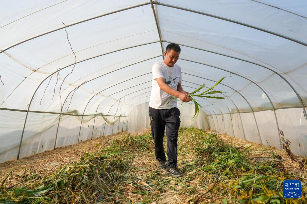 10月11日,院峪村党支部书记王增喜在蚂蚱大棚内投料喂食。