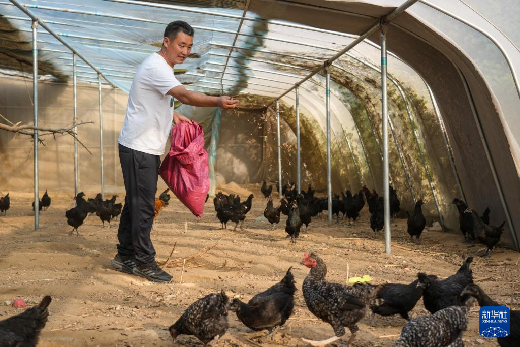 10月11日,院峪村党支部书记王增喜用养殖的蚂蚱喂养乌鸡等家禽。