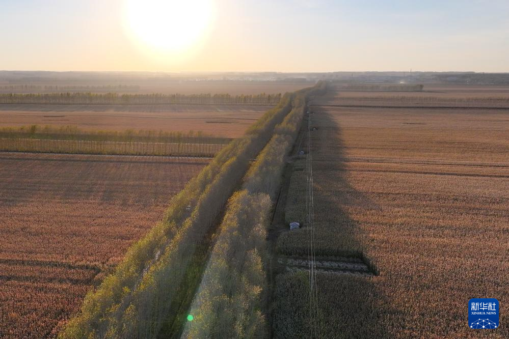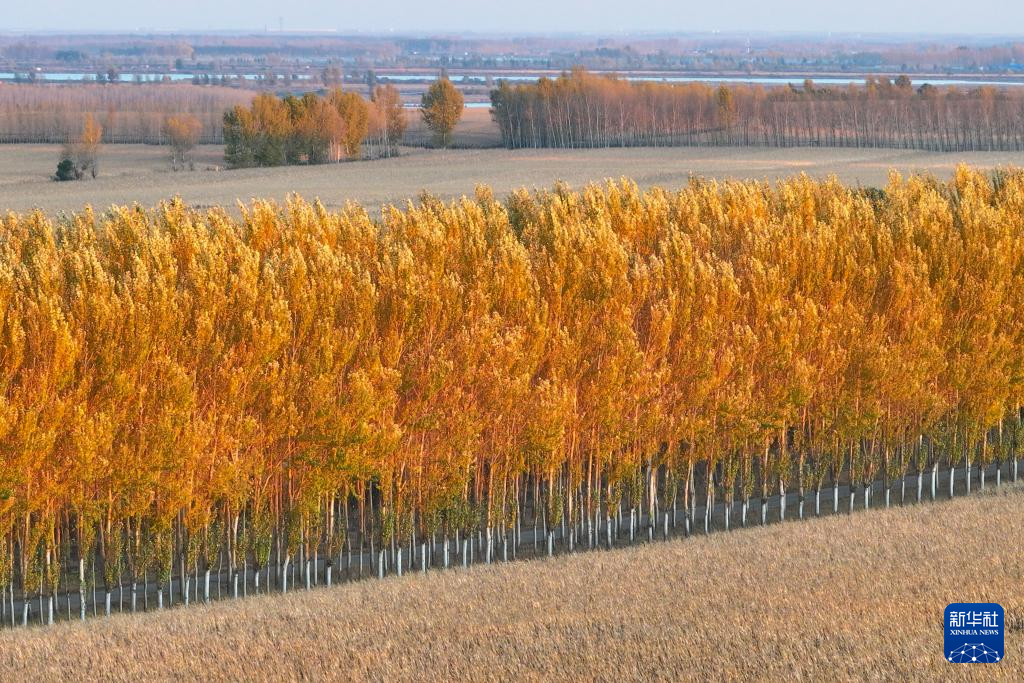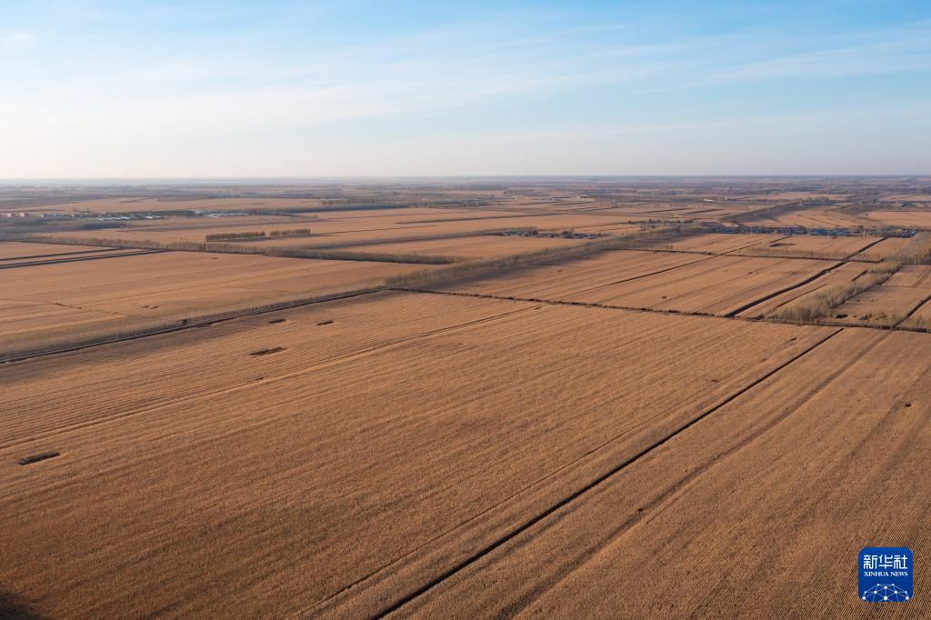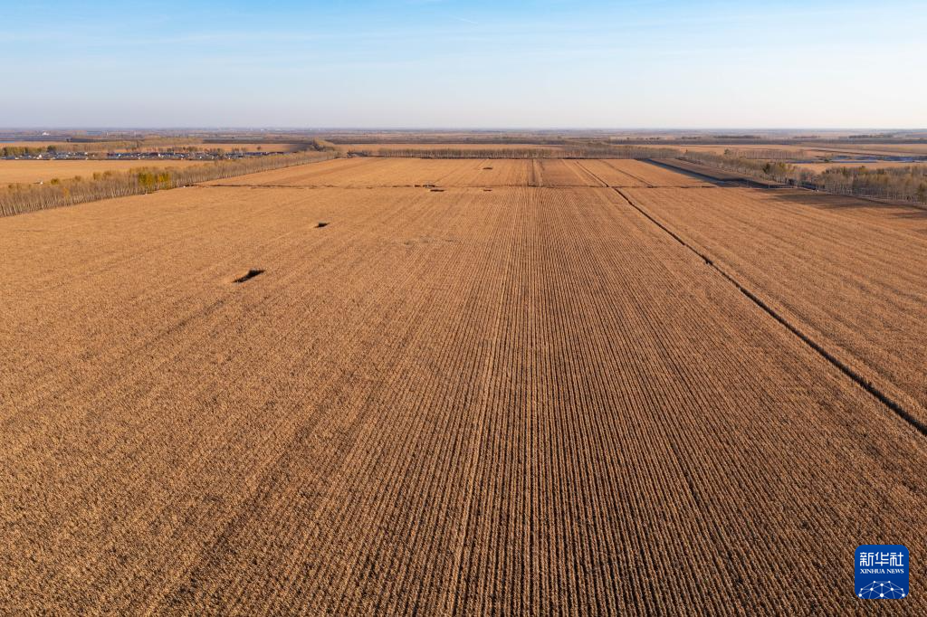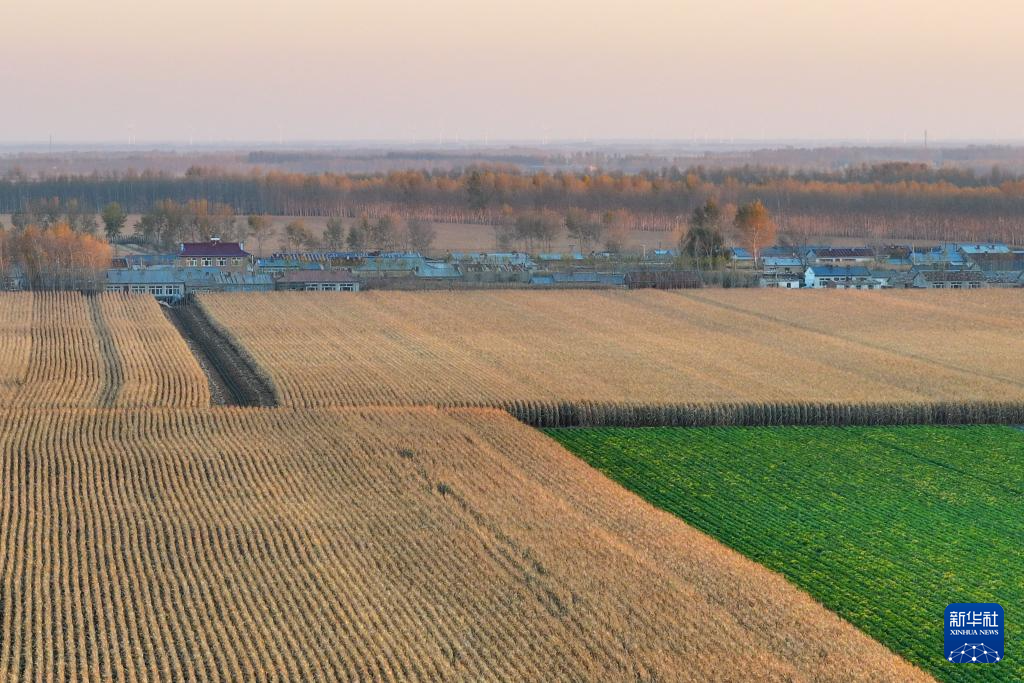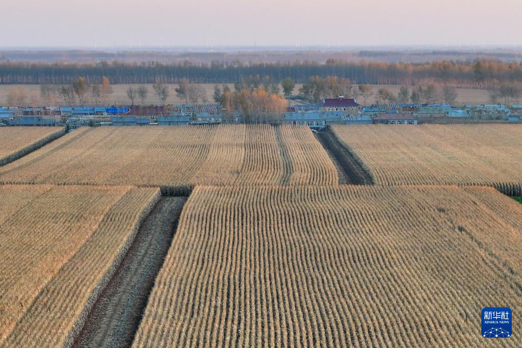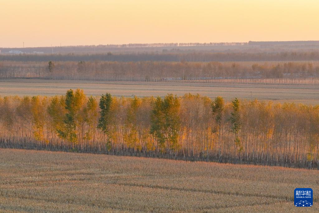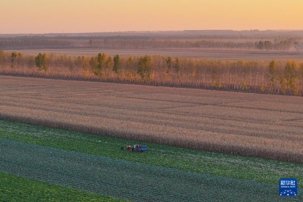 金秋时节,日落的阳光撒在黑龙江广袤的黑土地上,构成了一幅美丽的丰收画卷。