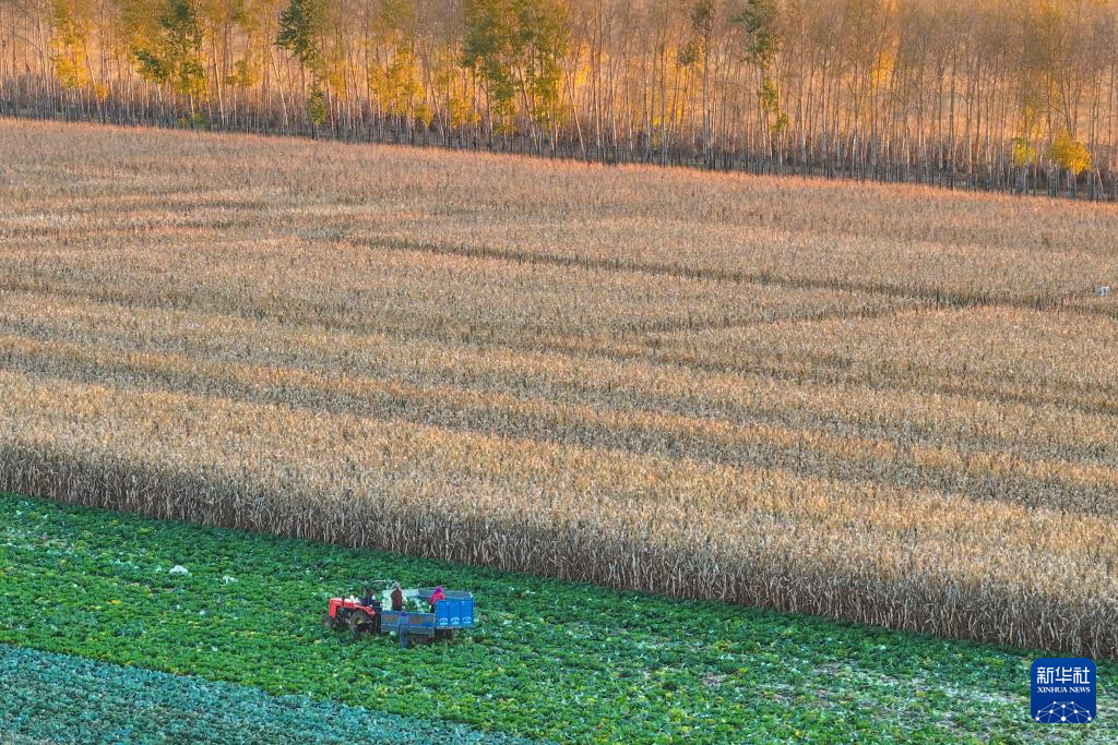 在肇东市五里明镇东升村,农民在田间收获青菜(无人机照片,10月11日摄)。