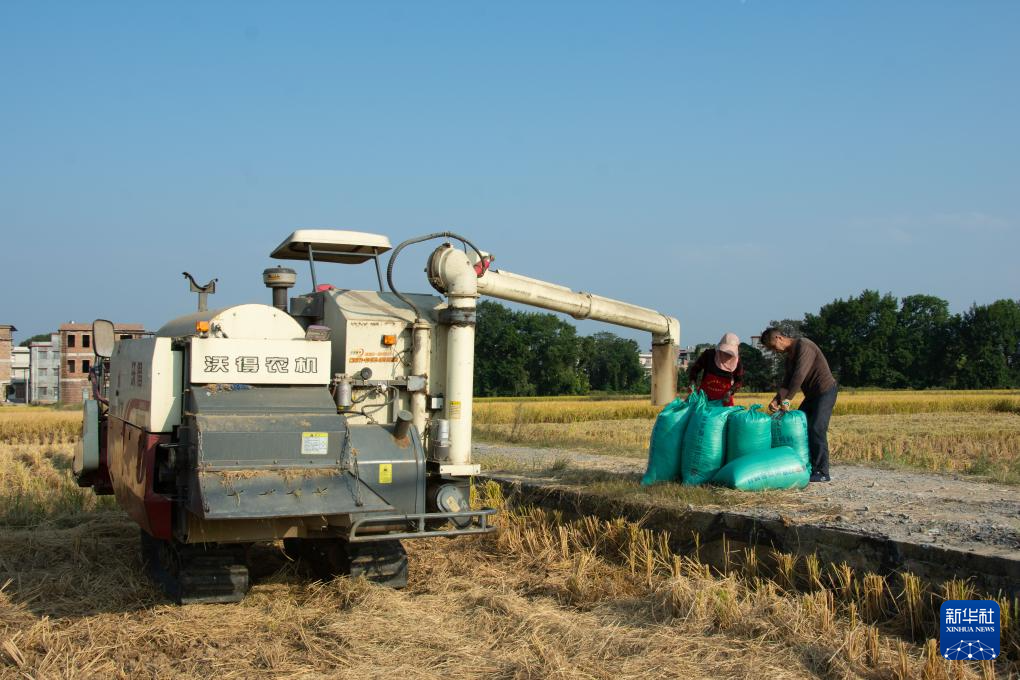 10月12日,在湖南省永州市蓝山县土市镇团结村,村民将收割的晚稻装袋。