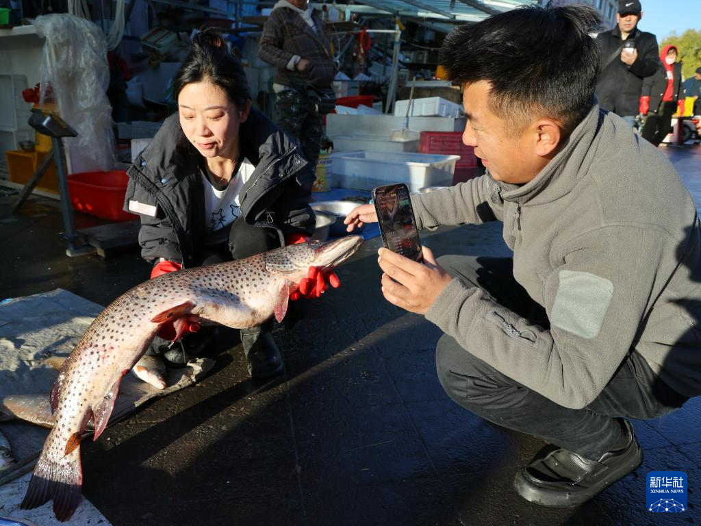 10月11日,游客在在黑龙江省抚远市的东极鱼市“打卡”拍照。