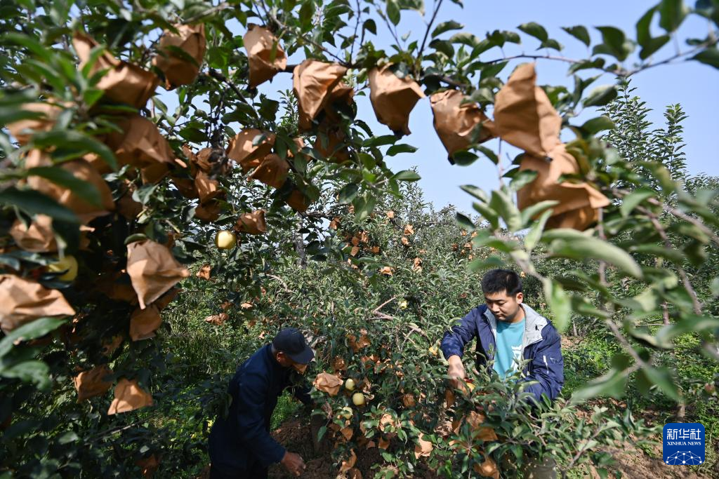 10月12日,在天津市蓟州区马伸桥镇育英洼村,种植户在采摘苹果。