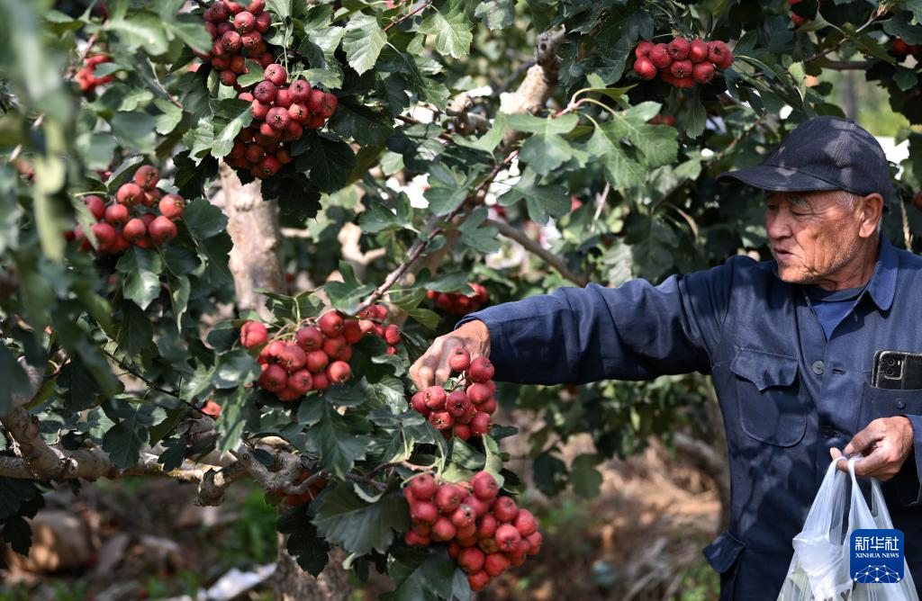 10月12日,在天津市蓟州区马伸桥镇育英洼村,村民在采摘山楂。