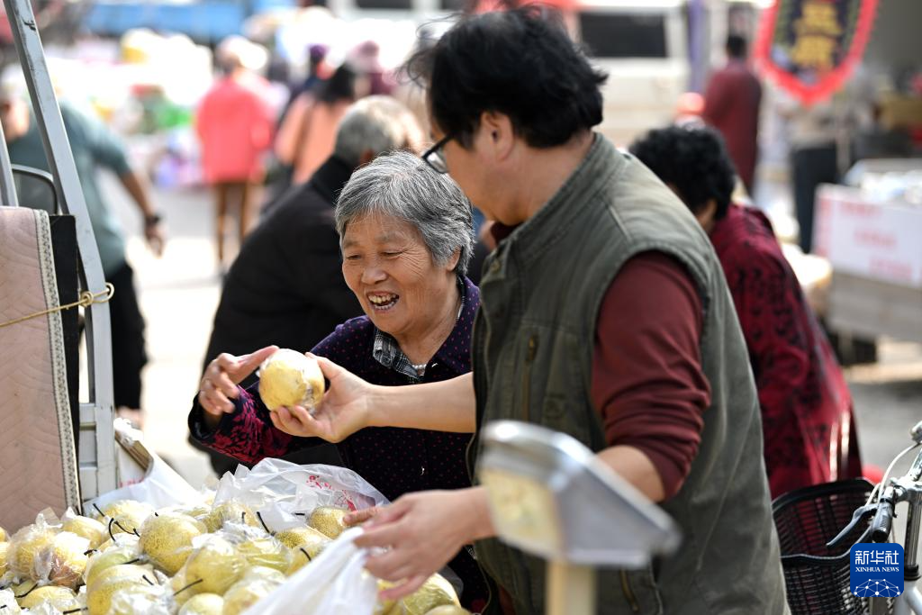 10月12日,在天津市蓟州区马伸桥镇集贸市场,一名老人在挑选梨子。