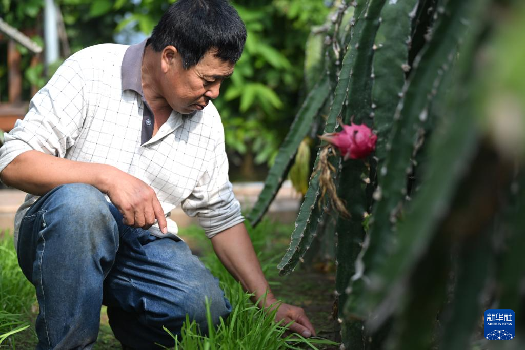 10月12日,在天津市蓟州区穿芳峪镇大巨各庄村,村民在火龙果种植区剪苗。