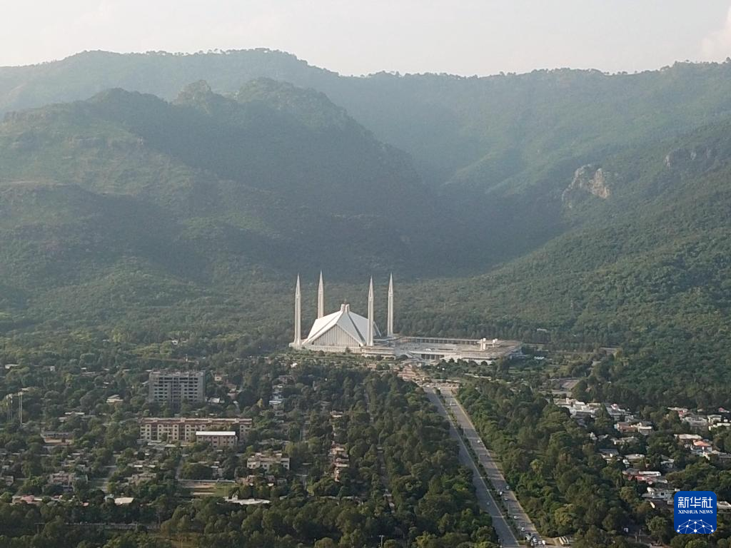 这是在巴基斯坦首都伊斯兰堡拍摄的默尔加拉山和坐落在山脚下的标志性建筑——费萨尔清真寺(无人机照片,10月8日摄)。