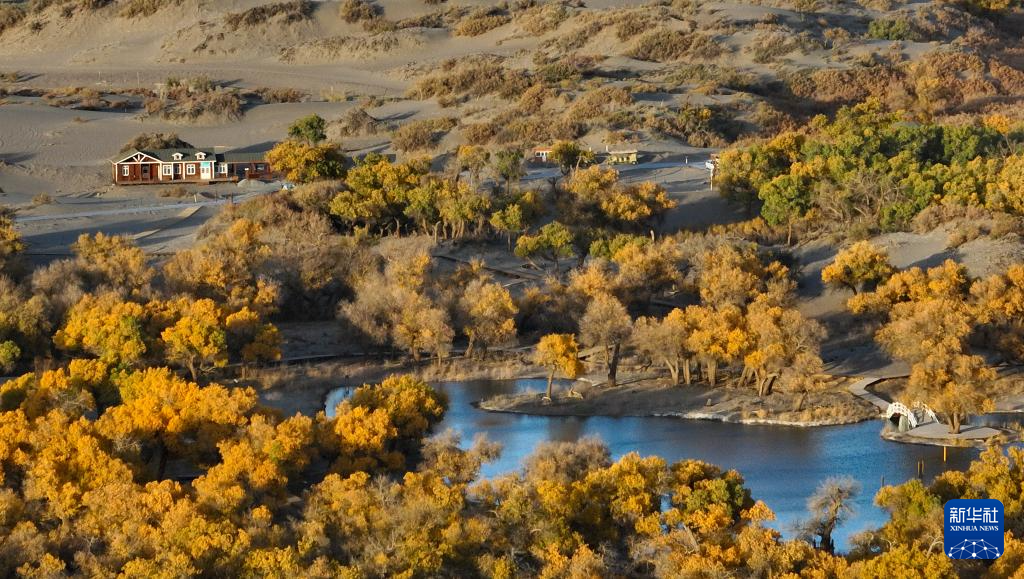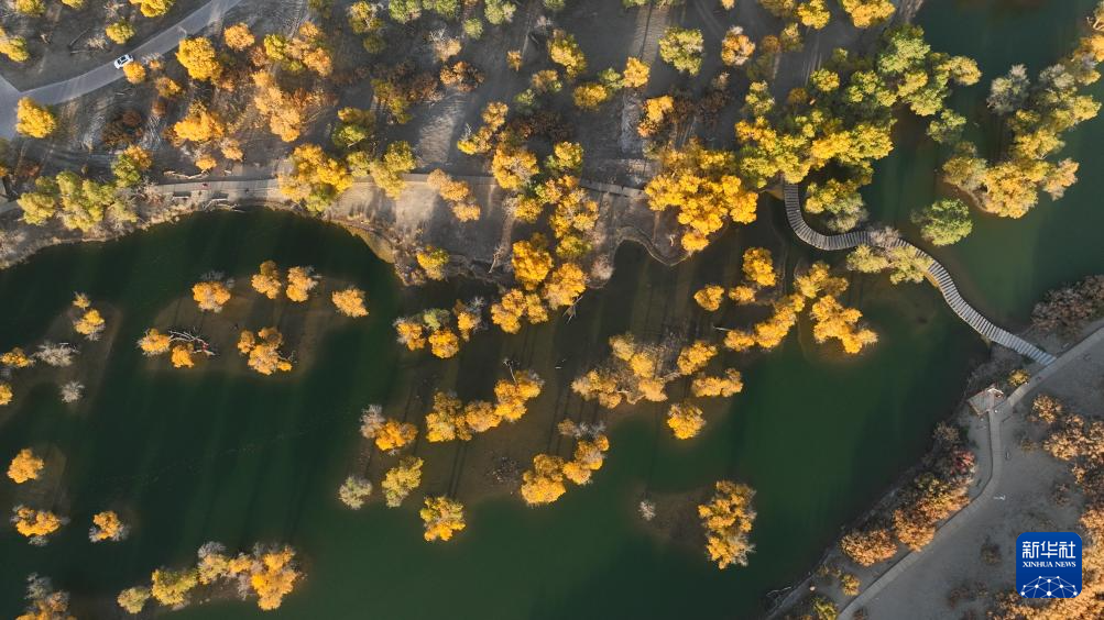 10月13日拍摄的内蒙古阿拉善盟额济纳旗大漠胡杨林景区(无人机照片)。