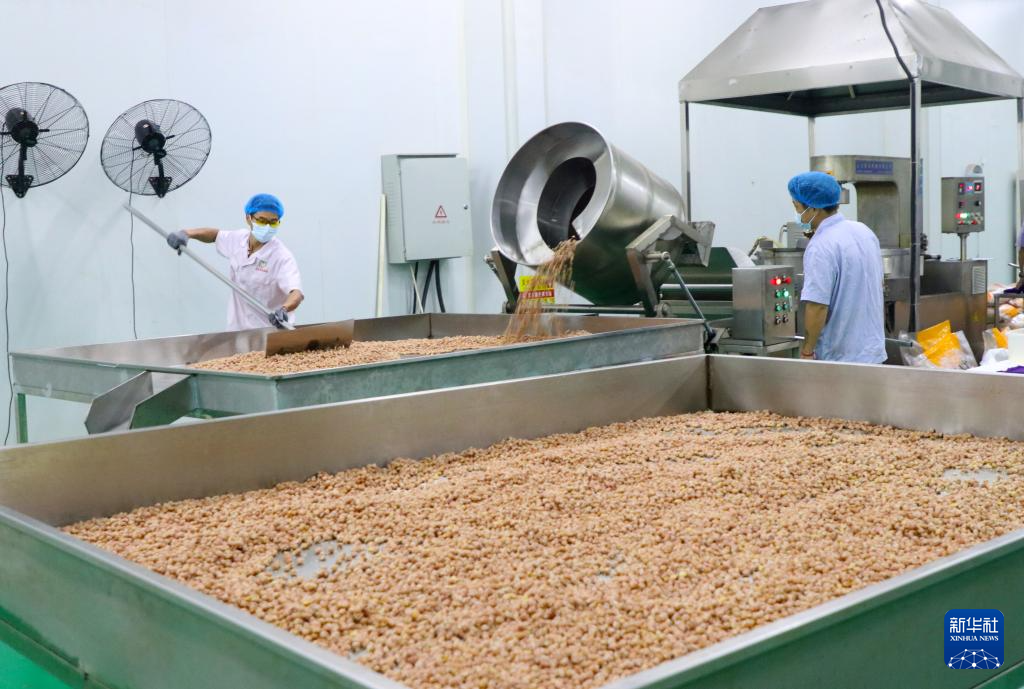 10月11日,在驻马店市正阳县一食品公司生产车间,工作人员在制作花生食品。