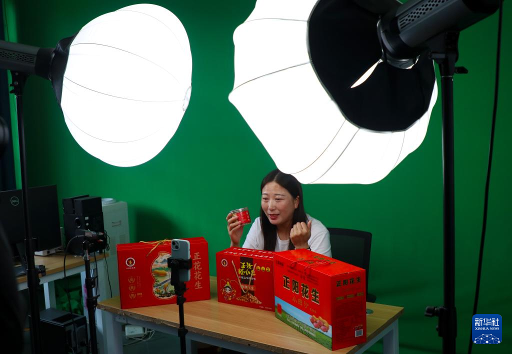 10月11日,在驻马店市正阳县电子商务运营服务中心,工作人员通过直播平台售卖花生食品。