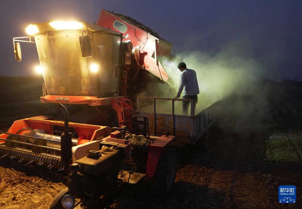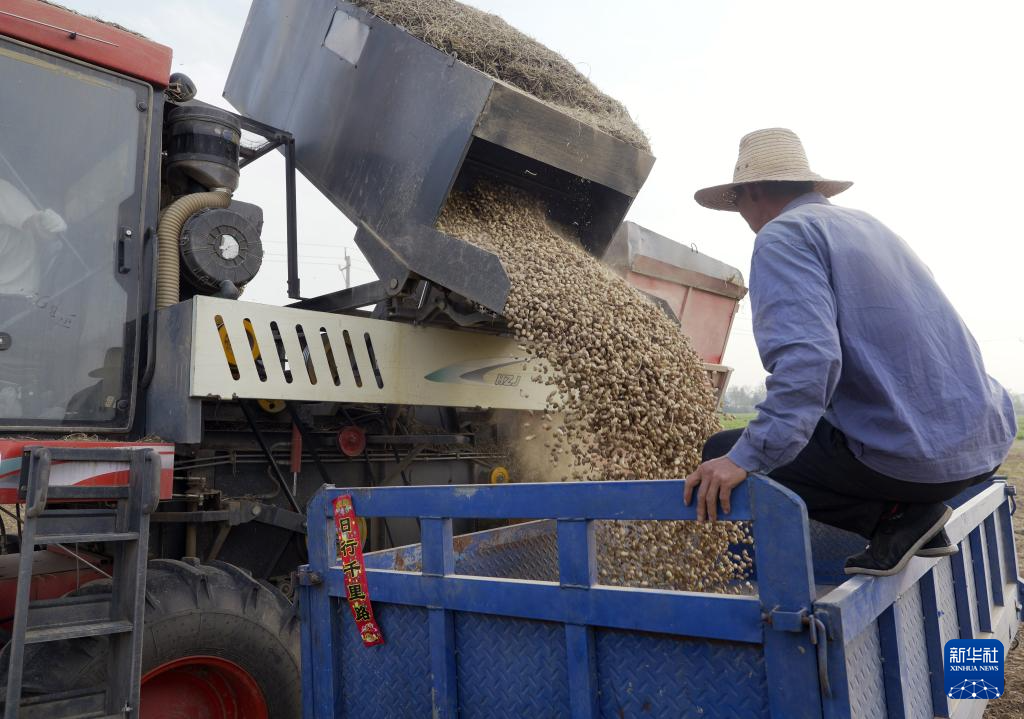 10月10日,在驻马店市正阳县熊寨镇王大塘村,收割摘果后的花生被倒入运输车辆。