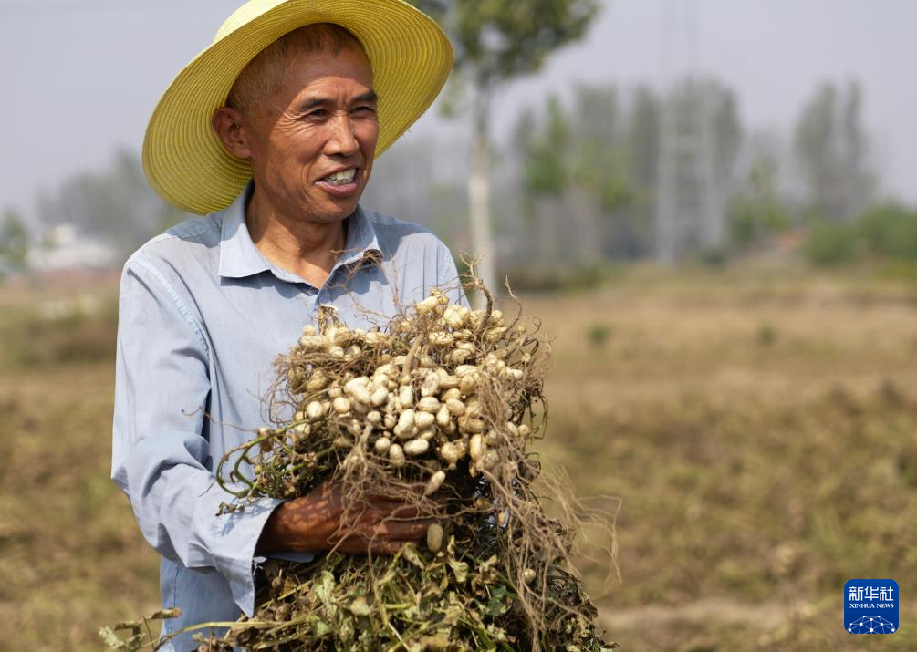 10月11日,在驻马店市正阳县慎水乡王牌寺村,村民展示收获的花生。