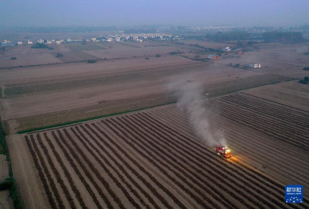10月10日,在驻马店市正阳县新阮店乡万马村,工作人员驾驶机械设备对晾晒完的花生进行摘果(无人机照片)。