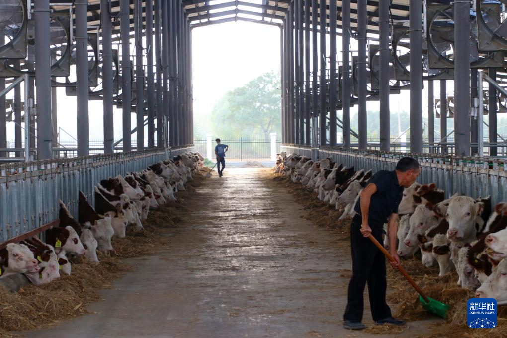 10月10日,在驻马店市正阳县一牛场,工作人员给牛投喂花生秧、秸秆等原料制成的混合饲料。