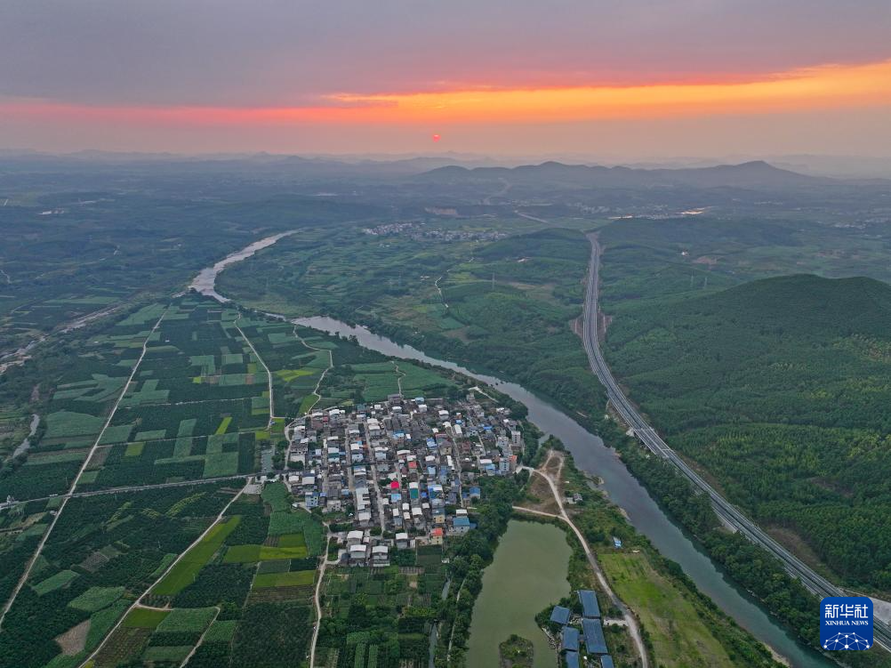 这是落日余晖下的广西来宾市象州县罗秀镇纳禄村(10月9日摄,无人机照片)。