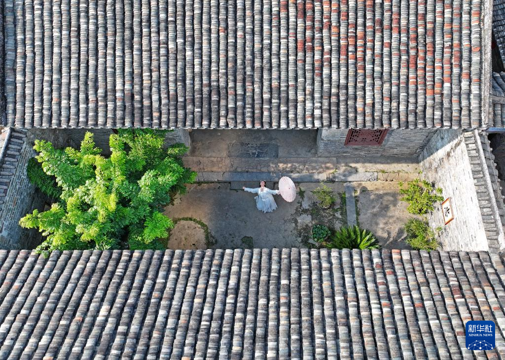 游客在广西来宾市象州县罗秀镇纳禄村的古宅中翩翩起舞(10月10日摄,无人机照片)。