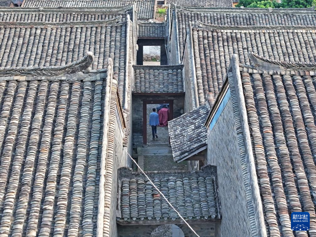村民行走在广西来宾市象州县罗秀镇纳禄村的古巷中(10月9日摄,无人机照片)。
