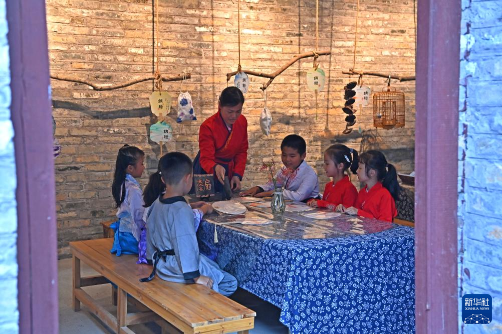 一名老师带着几名孩子在广西来宾市象州罗秀镇纳禄村学习扇面制作(10月10日摄)。