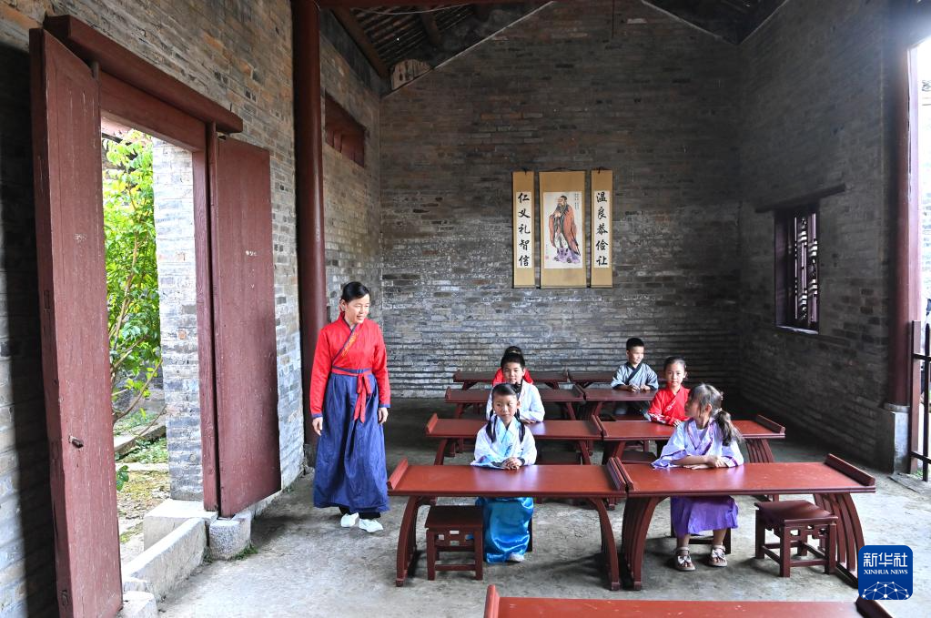 一名老师带着几名孩子在广西来宾市象州县罗秀镇纳禄村的古学堂里体验(10月10日摄)。