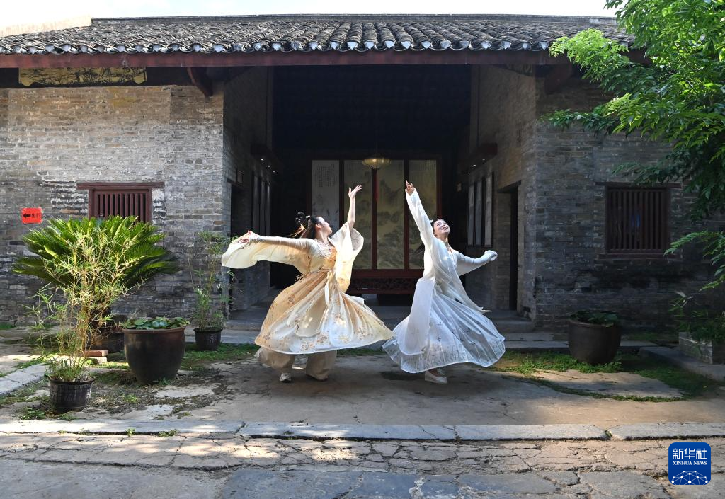 两名游客在广西来宾市象州县罗秀镇纳禄村的古宅里翩翩起舞(10月10日摄)。