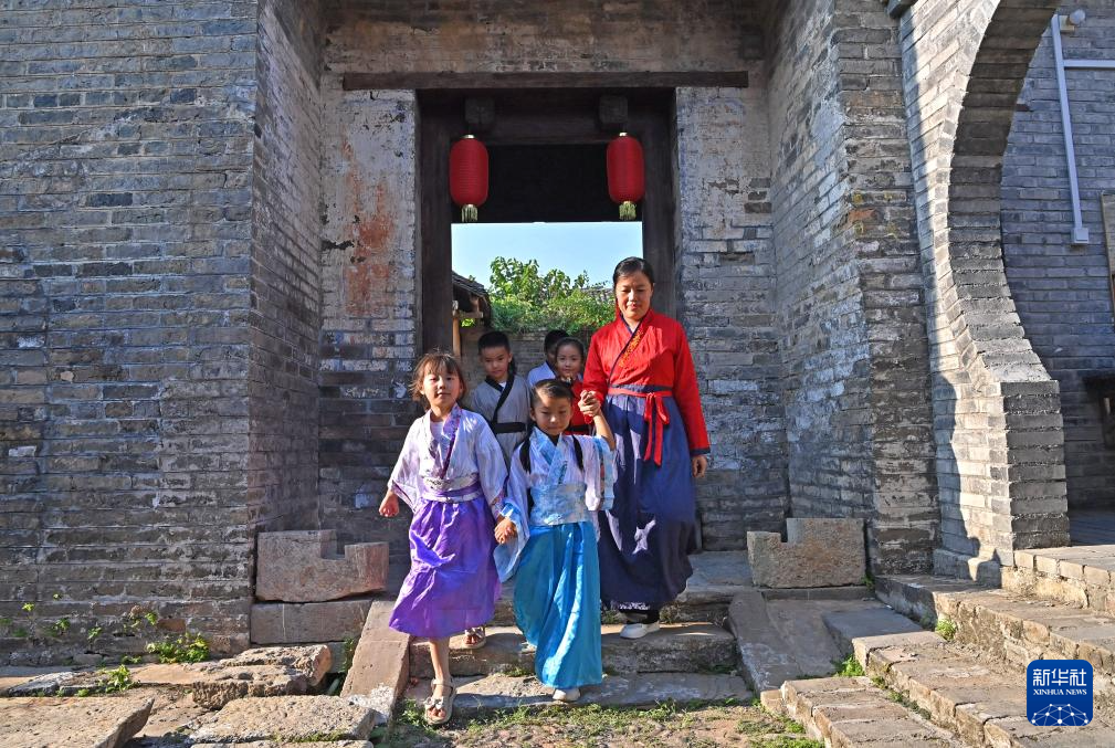 老师带着孩子们行走在广西来宾市象州县罗秀镇纳禄村的古建筑群里(10月10日摄)。