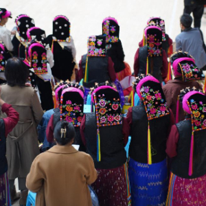 10月11日,佩戴藏族刺绣头帕的妇女在四川省丹巴县县城参加活动。