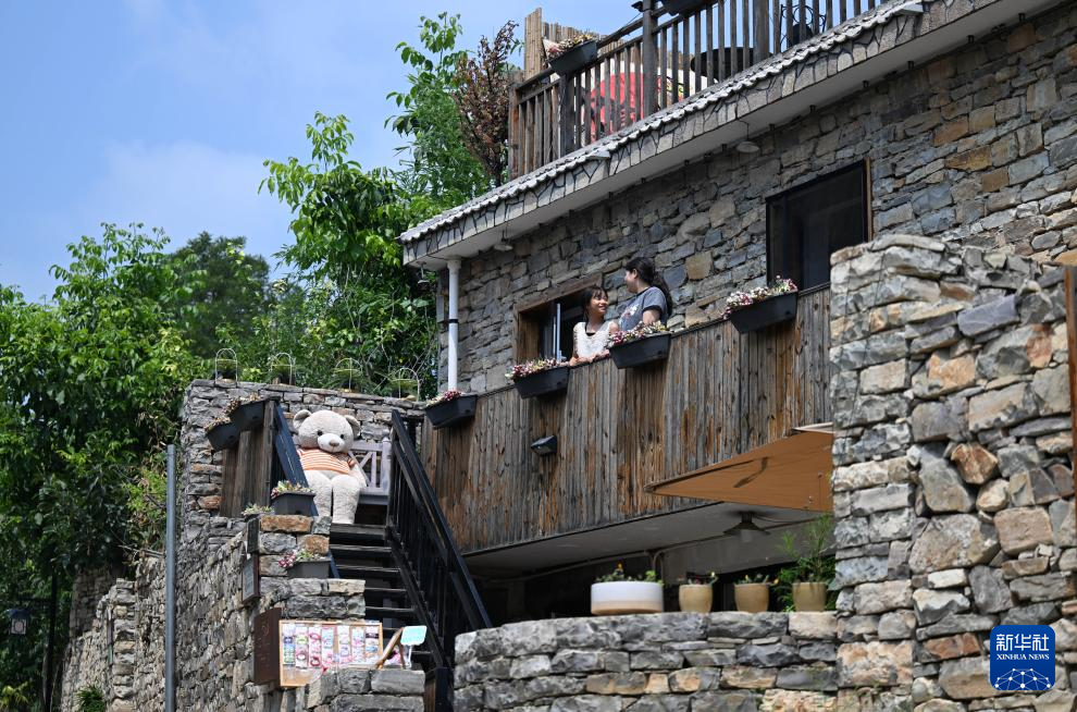 游客在西井峪村的一家民宿阳台休息聊天(7月6日摄)。
