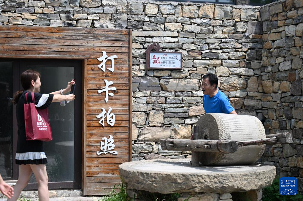 游客在西井峪村的一处石碾打卡拍照(7月6日摄)。