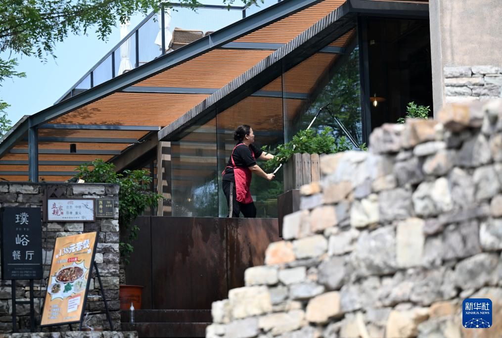 在西井峪村的一家民宿,工作人员在清理玻璃(7月6日摄)。