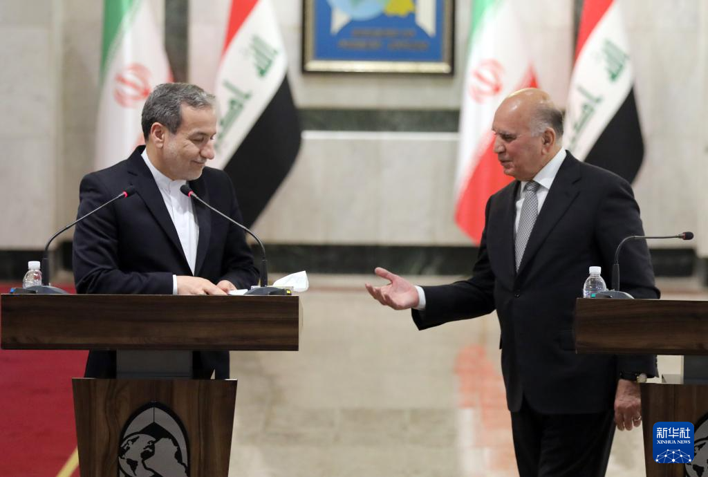 10月13日,伊拉克外长侯赛因(右)同到访的伊朗外长阿拉格齐在首都巴格达举行会谈后参加联合记者会。