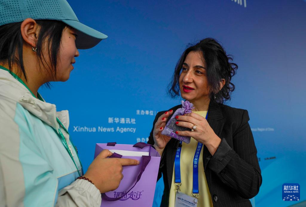 10月14日,志愿者为参会来宾介绍并赠送新疆特色产品。