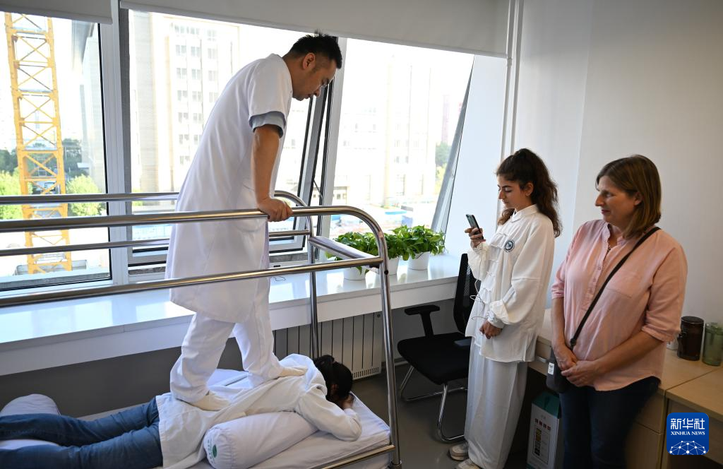 10月15日,在北京按摩医院朝阳院区,医疗按摩师曲怡(右)为外国友人进行推拿治疗。