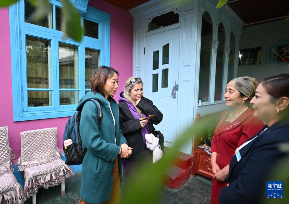 10月15日,与会嘉宾在吐鲁番市高昌区亚尔镇新城片区新城西门村参访时与当地居民交流。