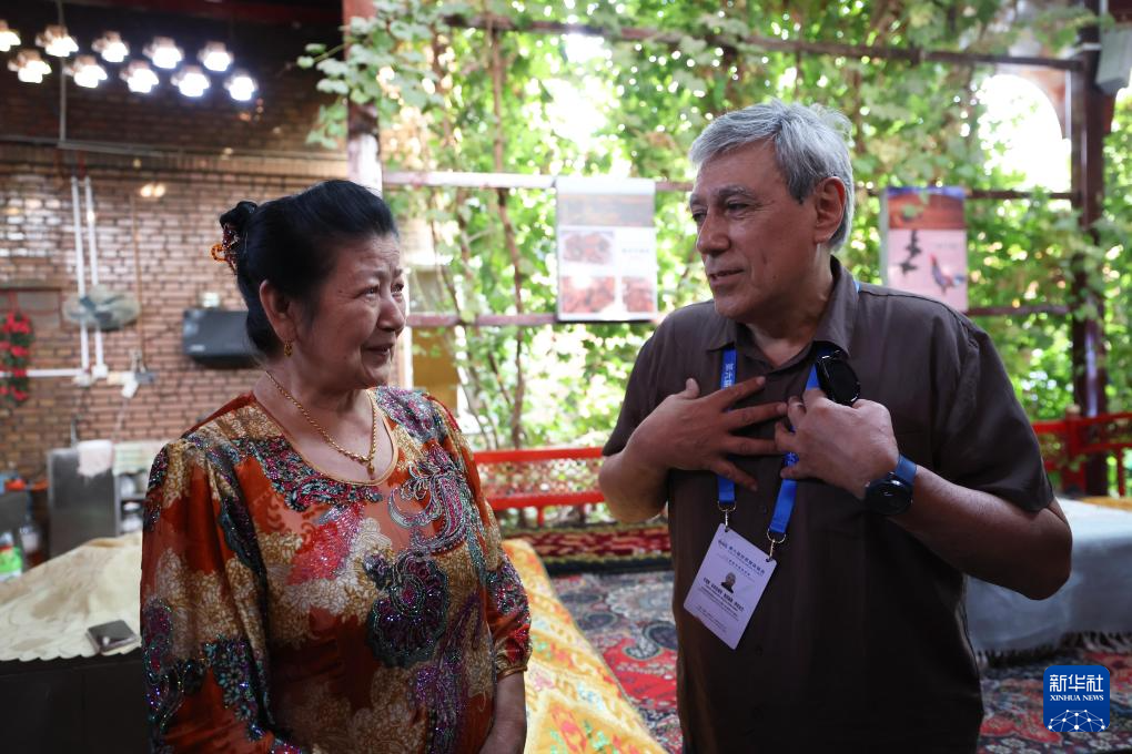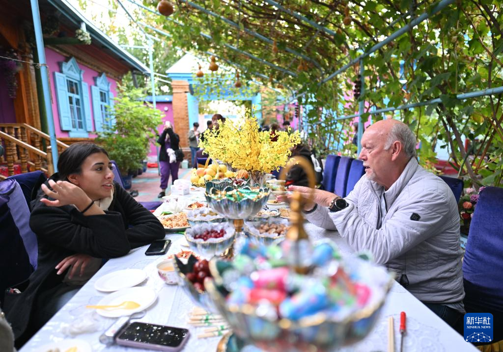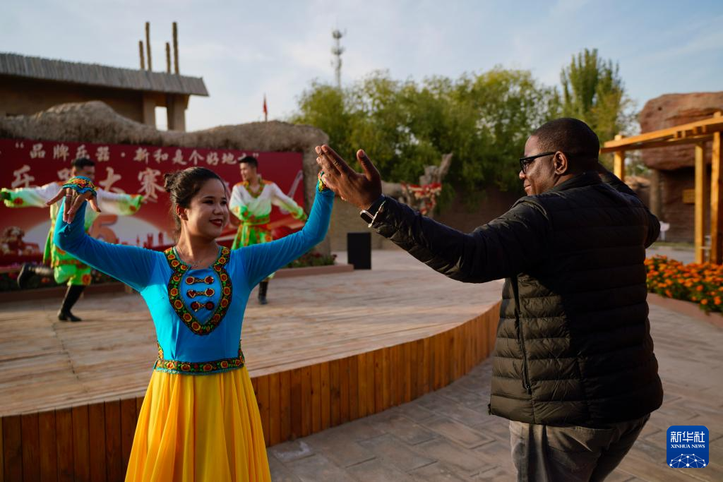 10月15日,与会嘉宾在伊宁市喀赞其民俗旅游区与表演者互动。
