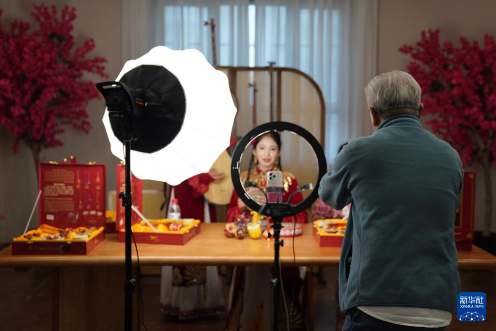 10月15日,与会嘉宾在阿克苏地区新和县加依村龟兹文化乐器展示中心观看工作人员直播。