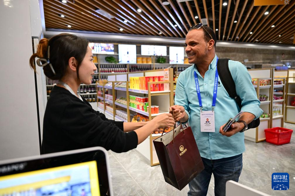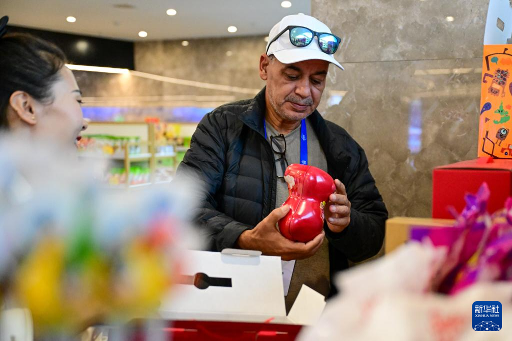10月15日,与会嘉宾在新疆喀什跨境电商进出口商品展示交易中心购买纪念品。