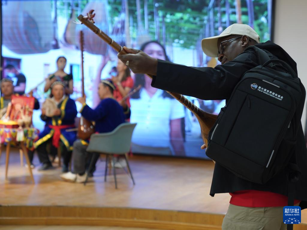 10月15日,与会嘉宾在阿克苏地区新和县加依村加依手工乐器产业园体验传统乐器。