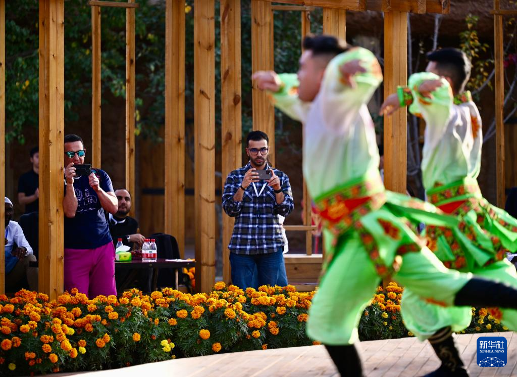 10月15日,与会嘉宾在阿克苏地区新和县加依村龟兹文化乐器展示中心欣赏舞蹈表演。