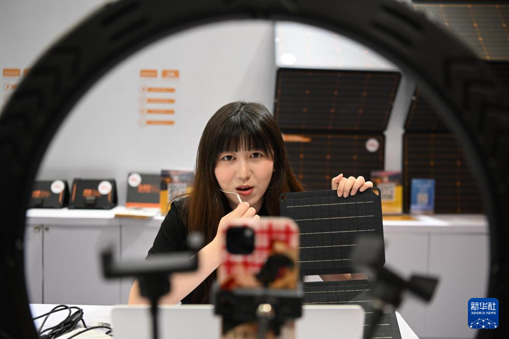 10月15日,工作人员在直播介绍便携式太阳能光伏板。