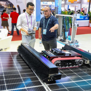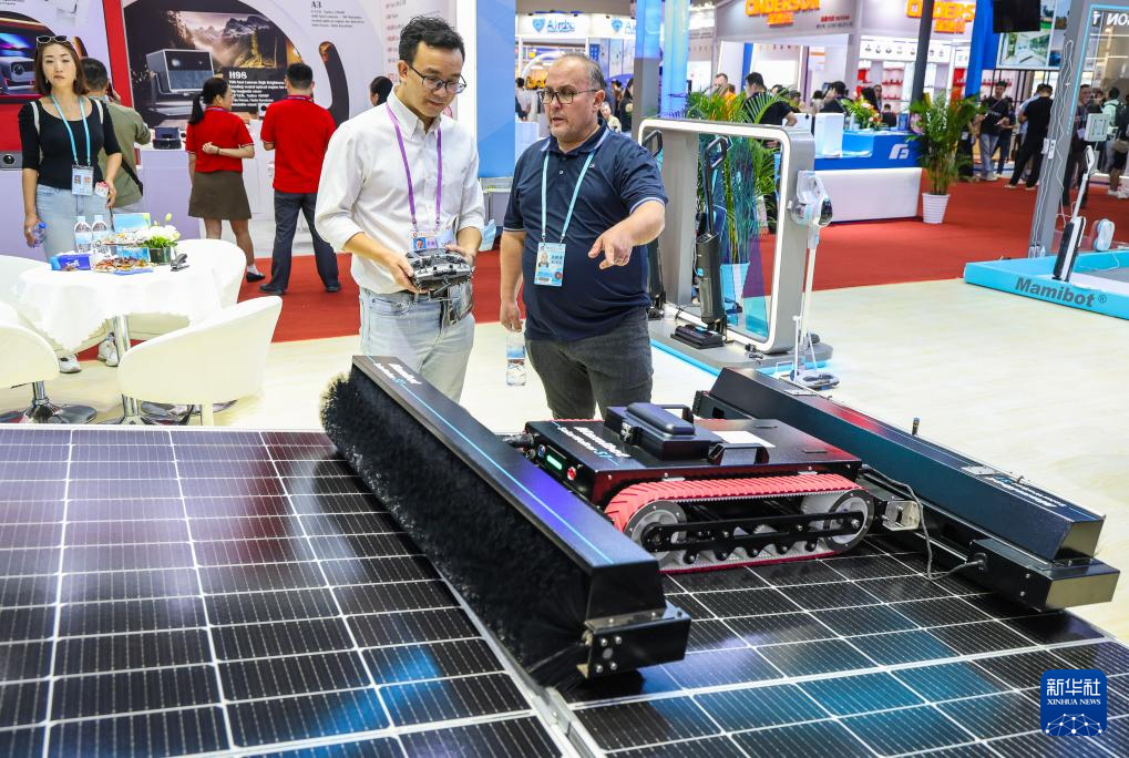 10月15日,采购商在第136届广交会展馆了解一款太阳能面板自动清洁机器人产品。