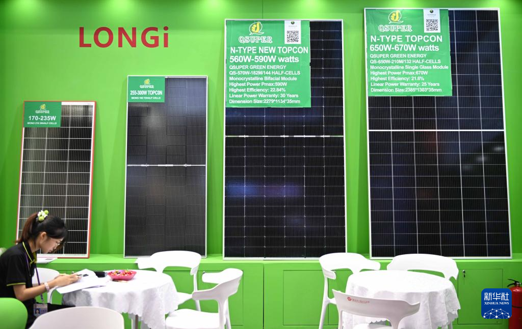 10月15日拍摄的广交会上的太阳能光伏板企业展台。