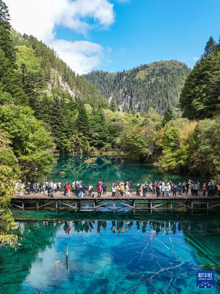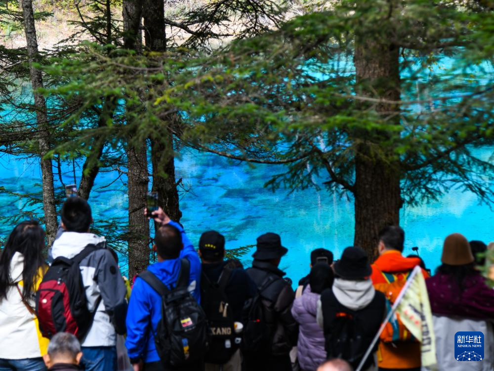 10月10日,游客在九寨沟景区五彩池观光游览。
