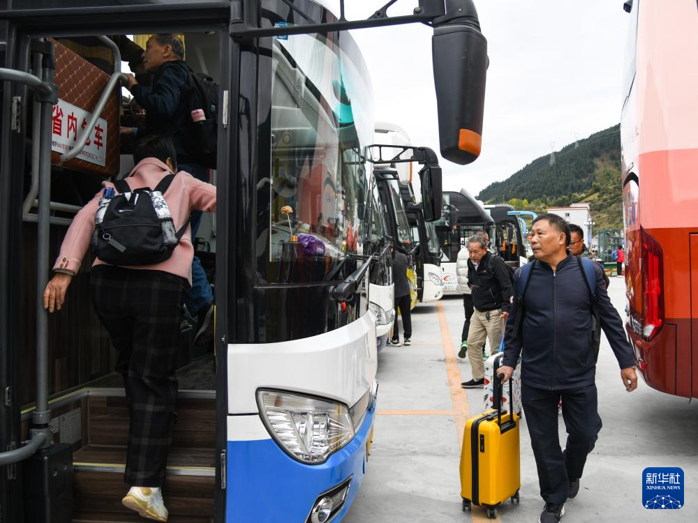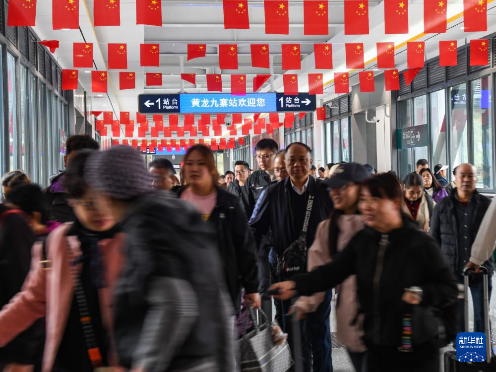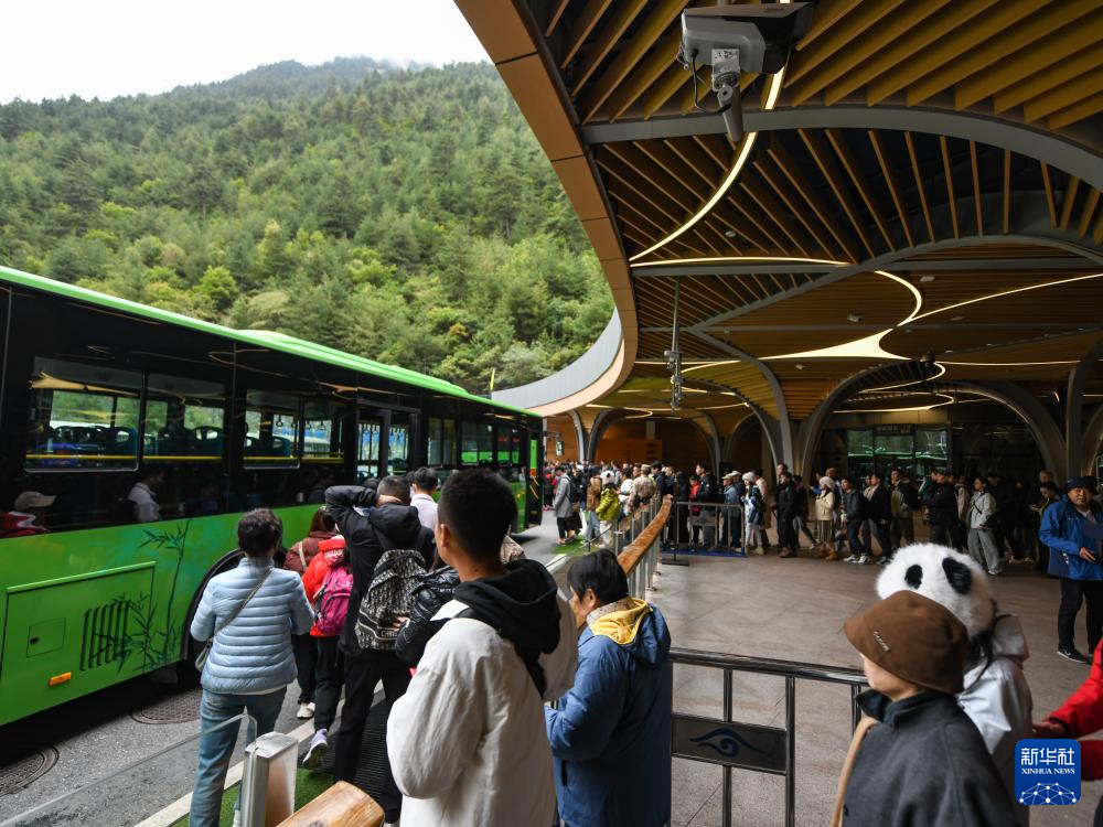 10月9日,游客在黄龙九寨站外乘坐通往景区的接驳车。
